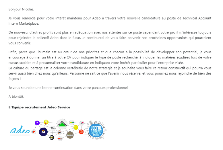 Quand on n’a pas le temps ni les ressources pour mettre de l’humain dans les réponses aux candidatures entrantes, il faut avoir l’humilité de se faire aider, et c’est que les équipes d’ADEO ont fait.